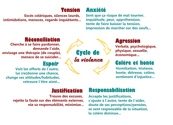 La violence conjugale ne survient pas toujours brutalement. Elle s'installe souvent selon un cycle de la violence : une tension sourde qui monte progressivement, jusqu'à un accès d'agression (crise), suivi d'excuses ou de promesses de changement (période dite de « lune de miel »), puis retour à la tension. À chaque répétition, les épisodes de violence deviennent plus fréquents et plus graves, épuisant la victime et rendant difficile la prise de recul. Comprendre ce cycle aide à identifier la situation et à trouver un soutien adapté.