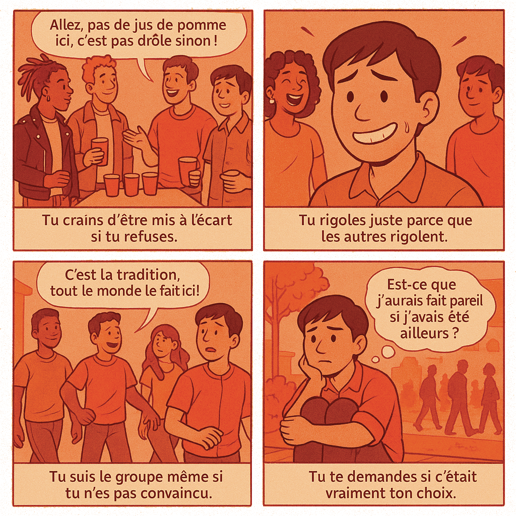 L'effet de groupe, c'est cette pression sociale qui nous pousse à « faire comme tout le monde » pour être accepté·e. En groupe, on a souvent tendance à imiter les autres ou à obéir aux règles implicites du groupe. Parfois c'est positif (entraide, esprit de cohésion), mais quand les comportements sont risqués, cela peut devenir dangereux. En milieu étudiant, la pression de groupe peut nous amener à boire beaucoup d'alcool, participer à un bizutage humiliant, tenir des propos sexistes ou « forcer » quelqu'un à faire ce qu'il ou elle ne veut pas.